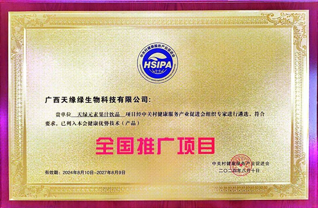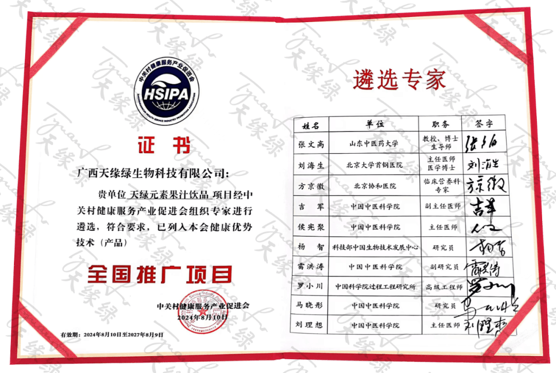 2024年8月10日,天緣綠集團(tuán)迎來(lái)了歷史性的榮耀時(shí)刻——母公司廣西天緣綠生物科技有限公司主研產(chǎn)品『天綠元素』,經(jīng)過(guò)中關(guān)村健康服務(wù)產(chǎn)業(yè)促進(jìn)會(huì)嚴(yán)苛而權(quán)威的遴選流程,憑借其卓越的產(chǎn)品品質(zhì)、創(chuàng)新的技術(shù)優(yōu)勢(shì)以及廣泛的市場(chǎng)潛力,正式被列入中關(guān)村健康服務(wù)產(chǎn)業(yè)促進(jìn)會(huì)健康優(yōu)勢(shì)技術(shù)(產(chǎn)品)全國(guó)推廣項(xiàng)目。