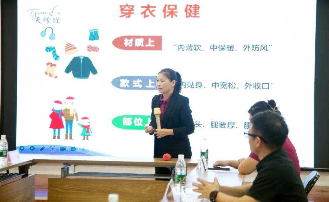 隨后,國(guó)家高級(jí)健康管理師黃秀森老師作為主講嘉賓,為大家?guī)?lái)了一場(chǎng)精彩的冬季保健知識(shí)講座。黃老師憑借豐富的專(zhuān)業(yè)知識(shí)和實(shí)踐經(jīng)驗(yàn),深入淺出地講解了冬季常見(jiàn)疾病的種類(lèi)及預(yù)防措施。她特別強(qiáng)調(diào)了穿衣、飲食、起居、運(yùn)動(dòng)四個(gè)方面在冬季保健中的重要性,并穿插分享了諸多實(shí)用的小技巧,如怎么選擇合適的保暖衣物、冬季男女養(yǎng)腎喝兩湯以及冬季泡腳的注意事項(xiàng)等,這些實(shí)用的知識(shí)技巧讓在場(chǎng)的聽(tīng)眾受益匪淺。