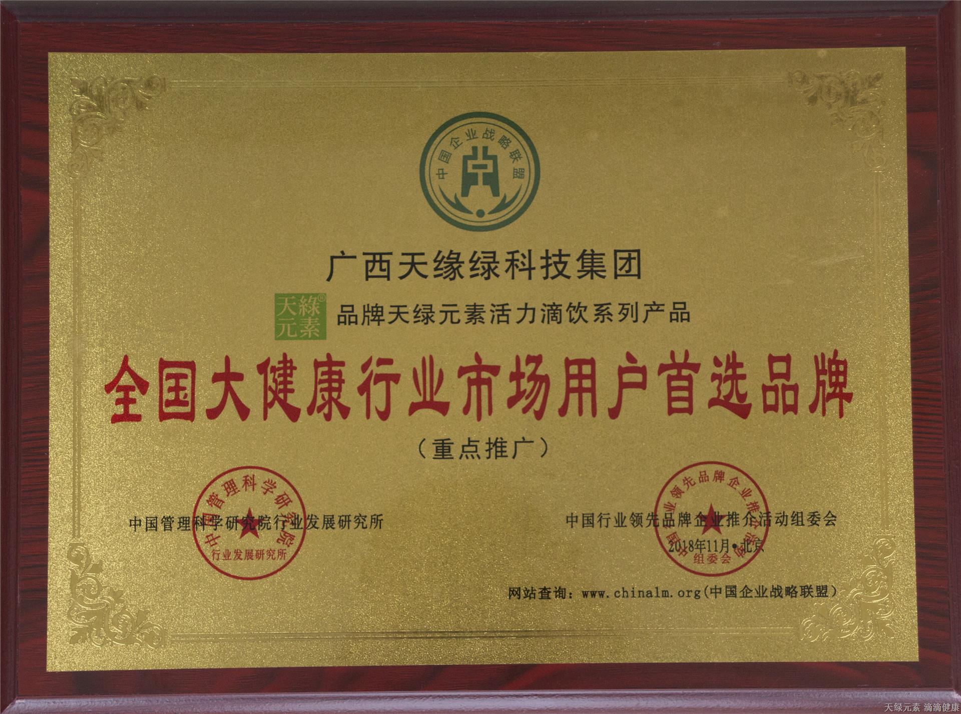 2018年11月, 天緣綠集團獲全國大健康行業(yè)市場用戶首選品牌稱號