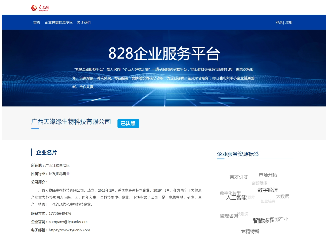 11月3日,廣西天緣綠科技集團(tuán)母公司--廣西天緣綠生物科技有限公司正式受邀加入了人民網(wǎng)828企業(yè)服務(wù)平臺(tái),這標(biāo)志著天緣綠集團(tuán)在數(shù)字化轉(zhuǎn)型和創(chuàng)新發(fā)展道路上邁出了重要一步。