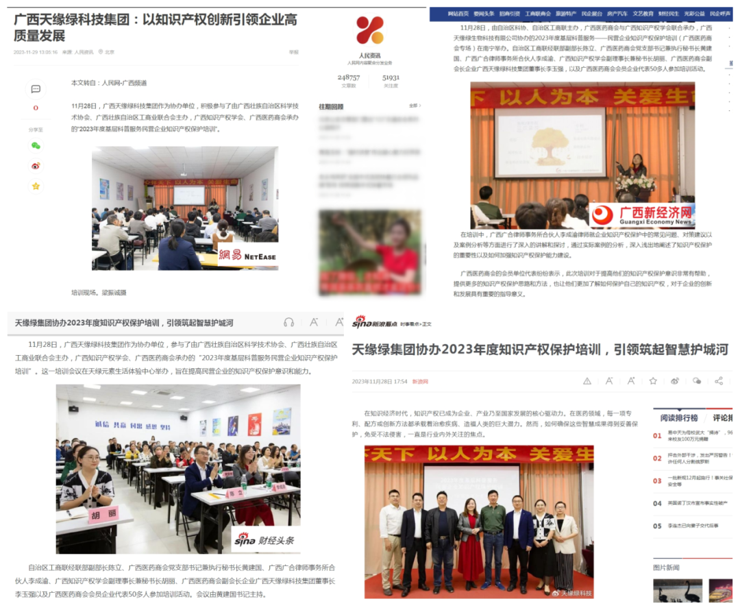 正因如此,這場培訓(xùn)會議受到了人民網(wǎng)的高度關(guān)注,并刊登了標(biāo)題為《廣西天緣綠科技集團(tuán):以知識產(chǎn)權(quán)創(chuàng)新引領(lǐng)企業(yè)高質(zhì)量發(fā)展》的報道。報道發(fā)布后,新浪新聞、網(wǎng)易新聞、搜狐以及廣西新經(jīng)濟(jì)網(wǎng)等多家知名媒體紛紛進(jìn)行了轉(zhuǎn)載,使得此次培訓(xùn)會議的影響得以進(jìn)一步擴(kuò)大,引發(fā)了社會對知識產(chǎn)權(quán)保護(hù)工作的廣泛關(guān)注和熱烈討論。
