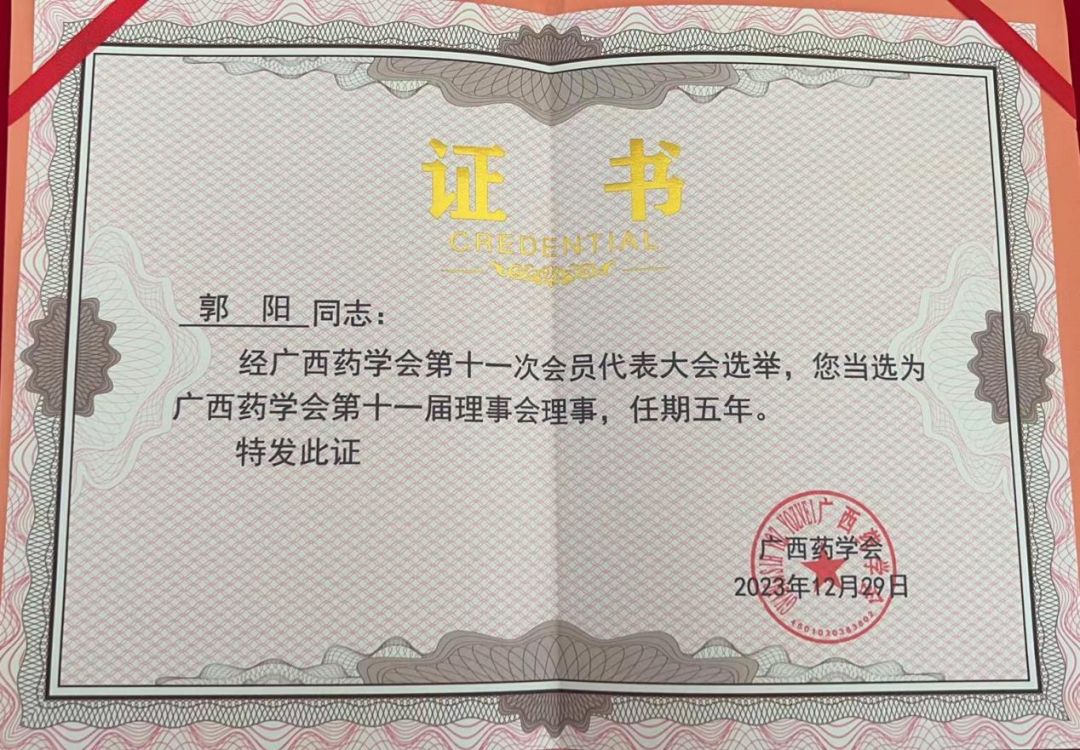 喜報(bào)!廣西天緣綠科技集團(tuán)運(yùn)營(yíng)總裁郭陽(yáng)——當(dāng)選廣西藥學(xué)會(huì)第十一屆理事會(huì)理事!