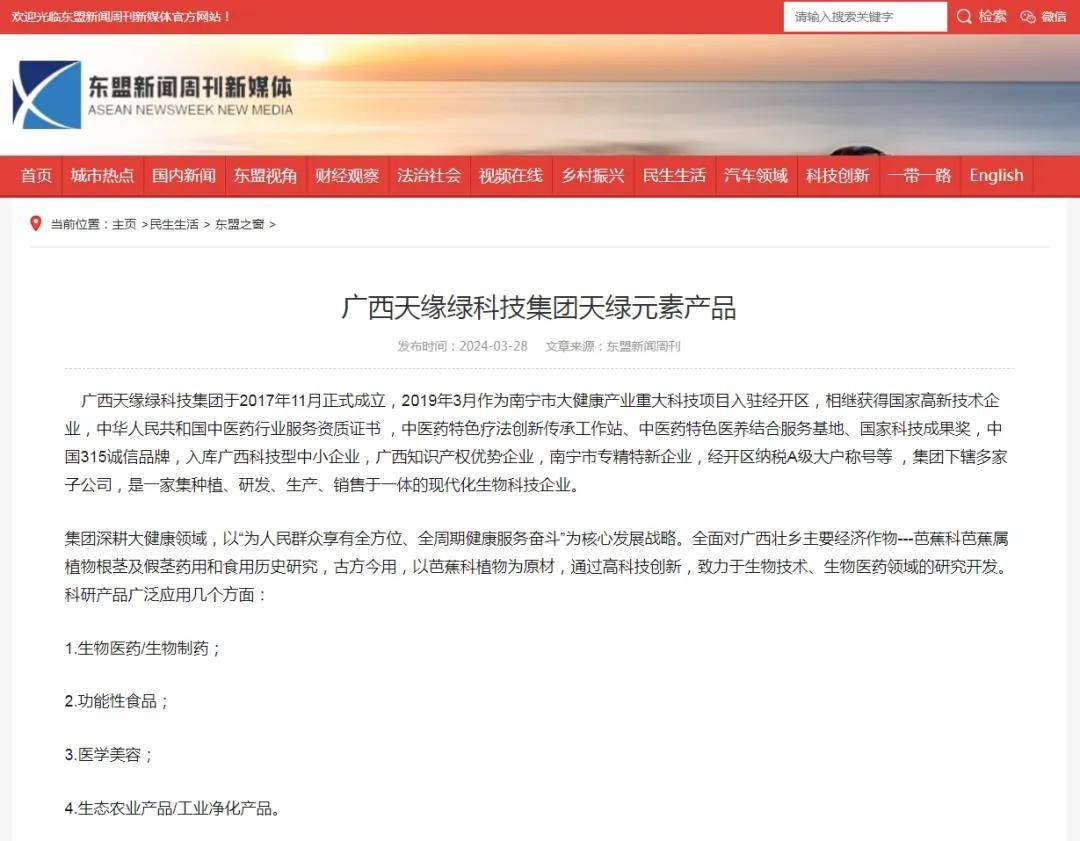 其中,東盟新聞周刊更是在其官方網(wǎng)站《東盟之窗》版塊上,對天緣綠集團的天綠元素系列產(chǎn)品進(jìn)行了重點展示與強烈推薦,這無疑是對天緣綠集團深耕大健康領(lǐng)域、不懈追求的最好認(rèn)可和背書。